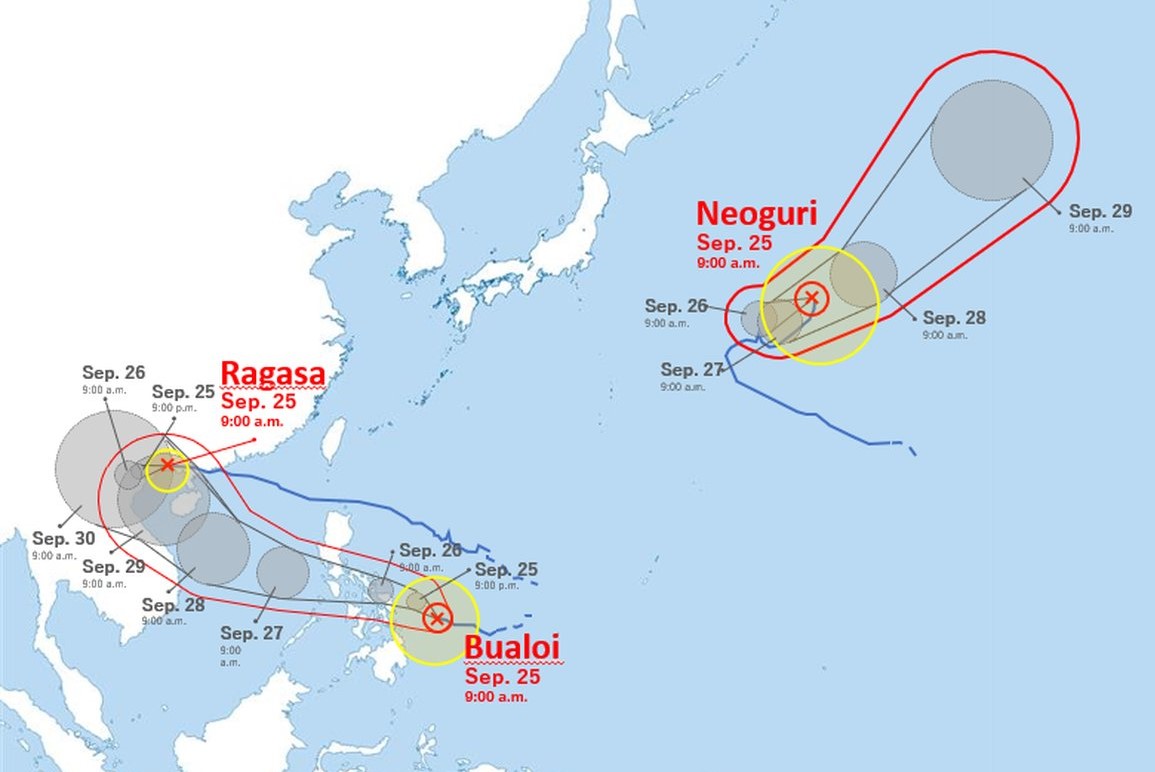 Typhoon Bualoi (Typhoon No. 20) is located east of the Philippines and strengthened to strong status at 3 a.m. Thursday. As of 9 a.m. Thursday, its central pressure is 965 hectopascals, with maximum instantaneous wind speeds of 198 kph. It is expected to maintain its strength and move westward through the South China Sea, heading toward Vietnam on Tuesday.