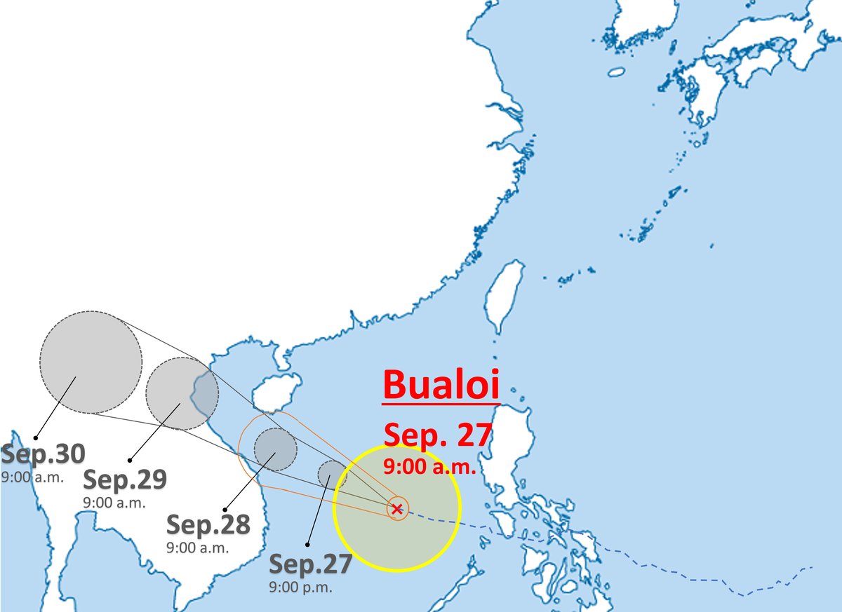 Typhoon Bualoi was in the South China Sea west of the Philippines at 9 a.m. Saturday, moving westward at 35 kph, according to the Japan Meteorological Agency.