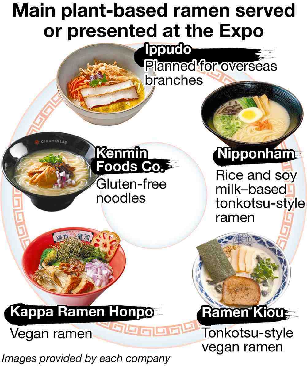 OSAKA — Ramen made with plant-based ingredients such as vegetable broth is drawing attention at the 2025 Osaka–Kansai Expo. Many people around the world avoid animal products for health or religious reasons, among others, creating demand for dishes catering to dietary restrictions.