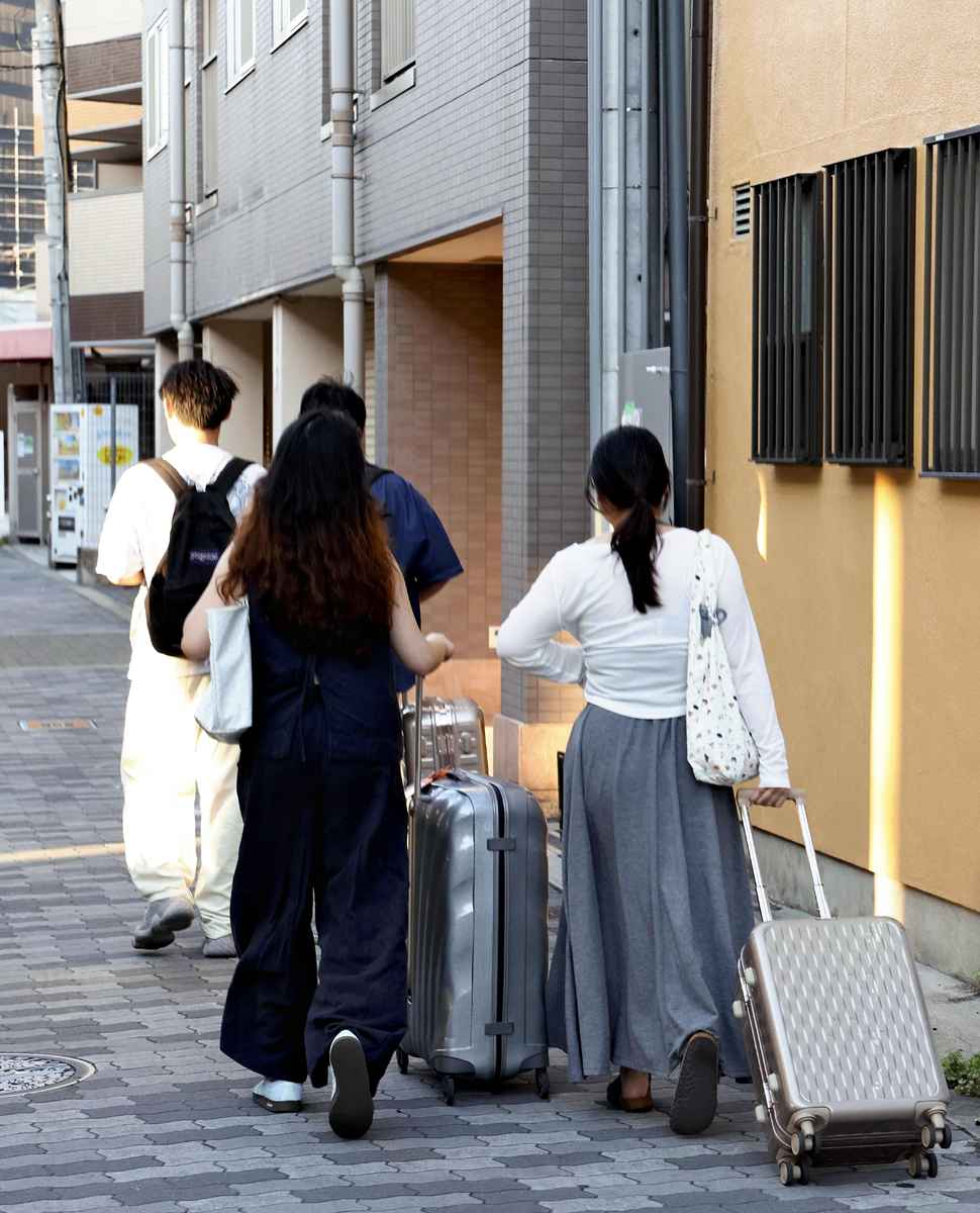 Foreign tourists walk with suitcases in a residential area in Nishinari Ward, Osaka, on Saturday.