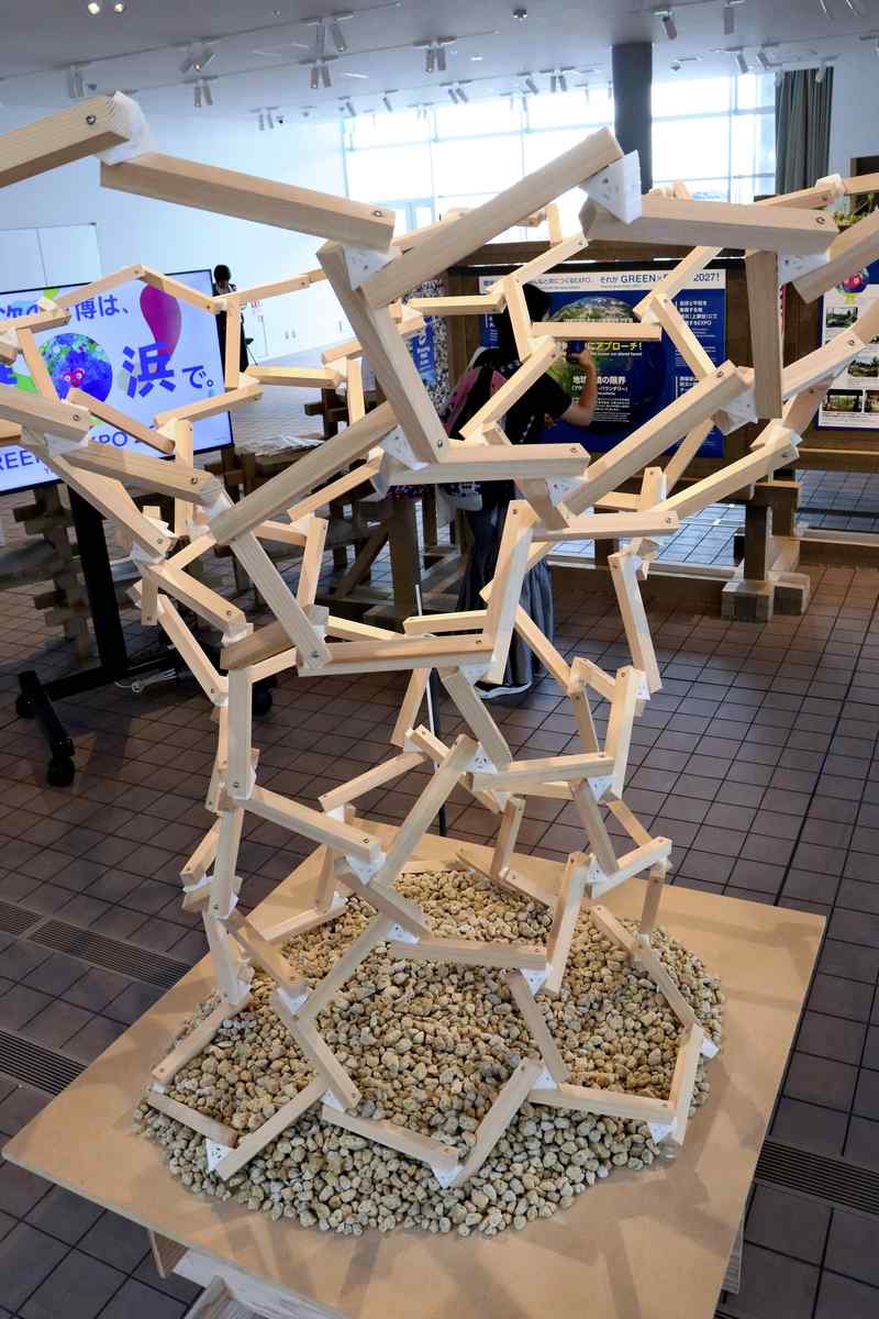 An exhibition for the 2027 event was held at the Expo from Sept. 23-27. In order to express the harmonious existence between humans and nature, the exhibition displayed such pieces as a wooden monument created by Yokohama-native architect Kengo Kuma to express future architecture, ikebana flower arrangements and bonsai, and the display stands were all made of recycled cardboard.