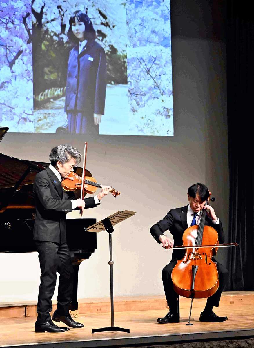 This year marks the 15th time such a concert has been held. Naoya Yoshida, 61, a violinist who was Megumi’s classmate, performed melodies of musical numbers including “Kosumosu no Yoh ni (Like a Cosmos Flower),” the lyrics of which were written by Sakie Yokota, 89, mother of Megumi and others.