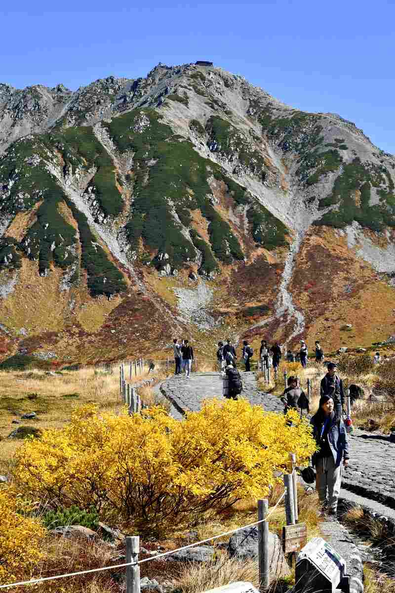 People watch vividly colored autumn leaves on the Murodo-daira plateau in Tateyama, Toyama Prefecture, on Thursday.