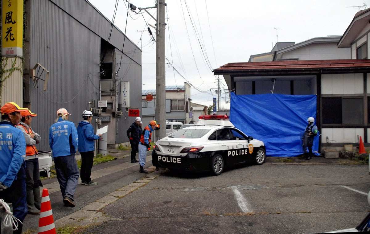Police officers guard a building where a bear is believed to have taken refuge on Monday in Yuzawa, Akita Prefecture.