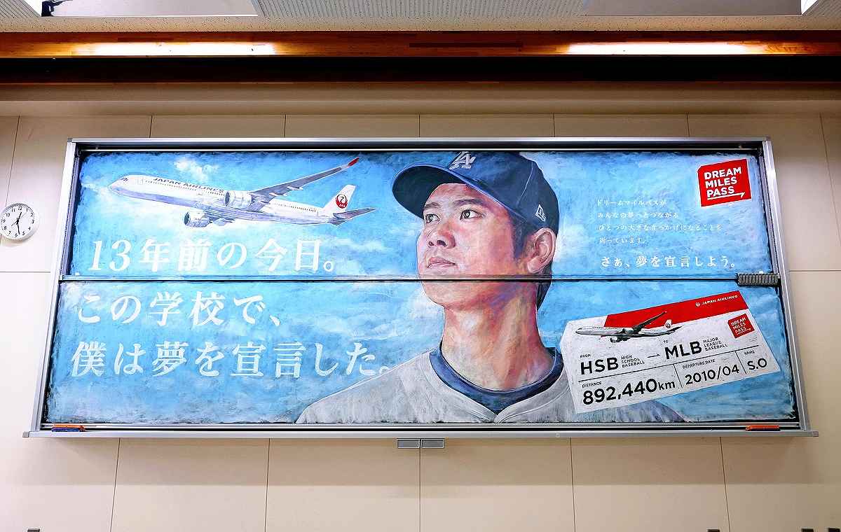 The artwork included a message in Japanese, which translated to: “It was 13 years ago today. Here at this school, I declared my dream,” referencing Ohtani’s announcement at the school on Oct. 21, 2012, that he would take on the challenge of playing in the Major Leagues. The project was planned by Japan Airlines Co., which has a support contract with Ohtani, and created by chalk artist Mayumi Kawano.