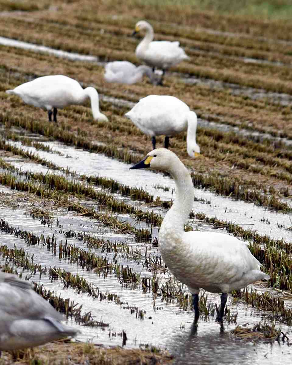Swans glean fallen ears of rice from a paddy in the Nishime community in Yurihonjo, Akita Prefecture. Recently, as winter has begun to approach, swans have been arriving across the prefecture. They nest in spots such as ponds and beside the city’s Koyoshi River, and during the day they search for food in places like rice paddies. However, a prefectural official warned, “People should not feed the swans and should maintain their distance when watching them, due to the risk of contracting avian influenza.”