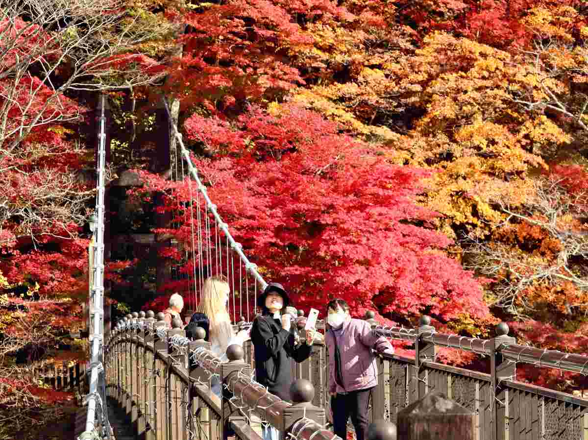 UTSUNOMIYA — Autumn foliage has reached its peak in the Shiobara Onsen area of Nasushiobara, Tochigi Prefecture. Maple and zelkova trees are displaying beautiful autumn colors, delighting visiting tourists around the “Kurenai Suspension Bridge” spanning the Hokigawa River.