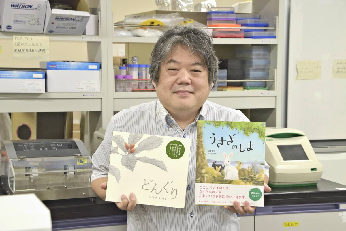 Shingo Kaneko, professor at Fukushima University, holds the picture book “Usagi no Shima” in his left hand.