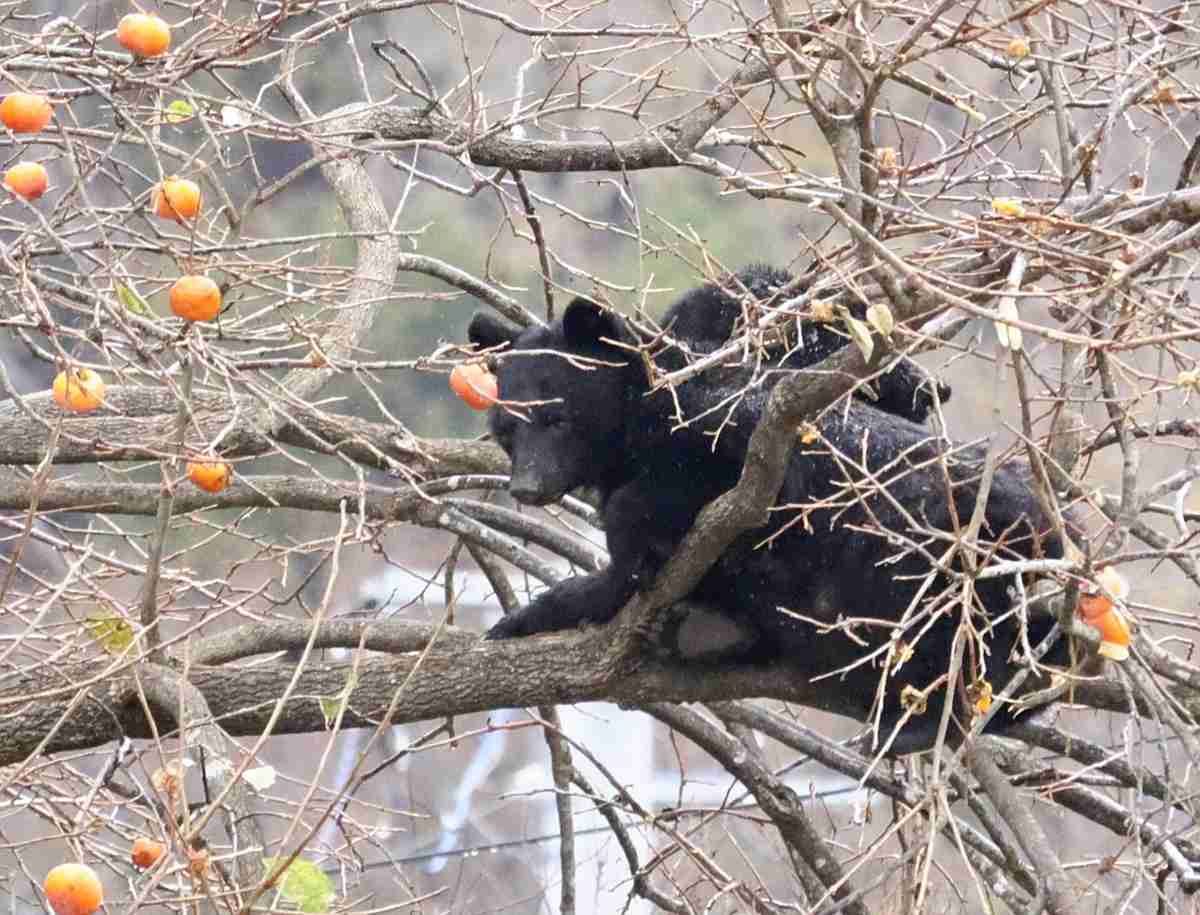 According to the Iwaizumi Police Station, a passerby reported what appeared to be two bears, believed to be a parent and cub, climbing a persimmon tree in a residential area of Iwaizumi at around 6 a.m. Monday. The bears remained in the tree for about 13 hours, eating persimmons. They descended the tree a little after 7 p.m. and headed west.