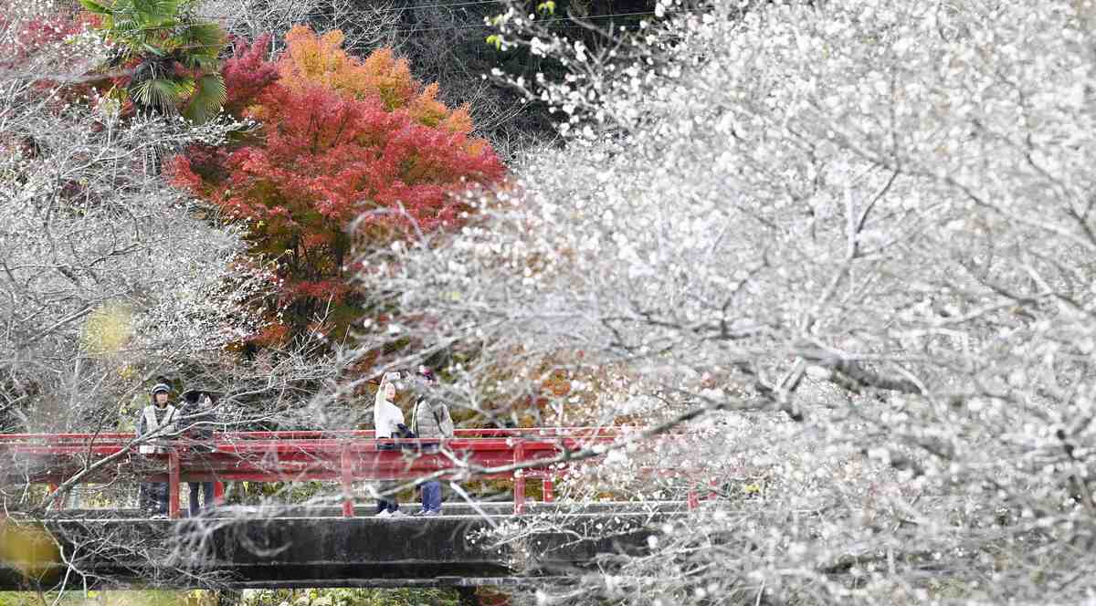 Shikizakura cherry trees bloom alongside autumn foliage in Toyota, Aichi Prefecture, on Monday,