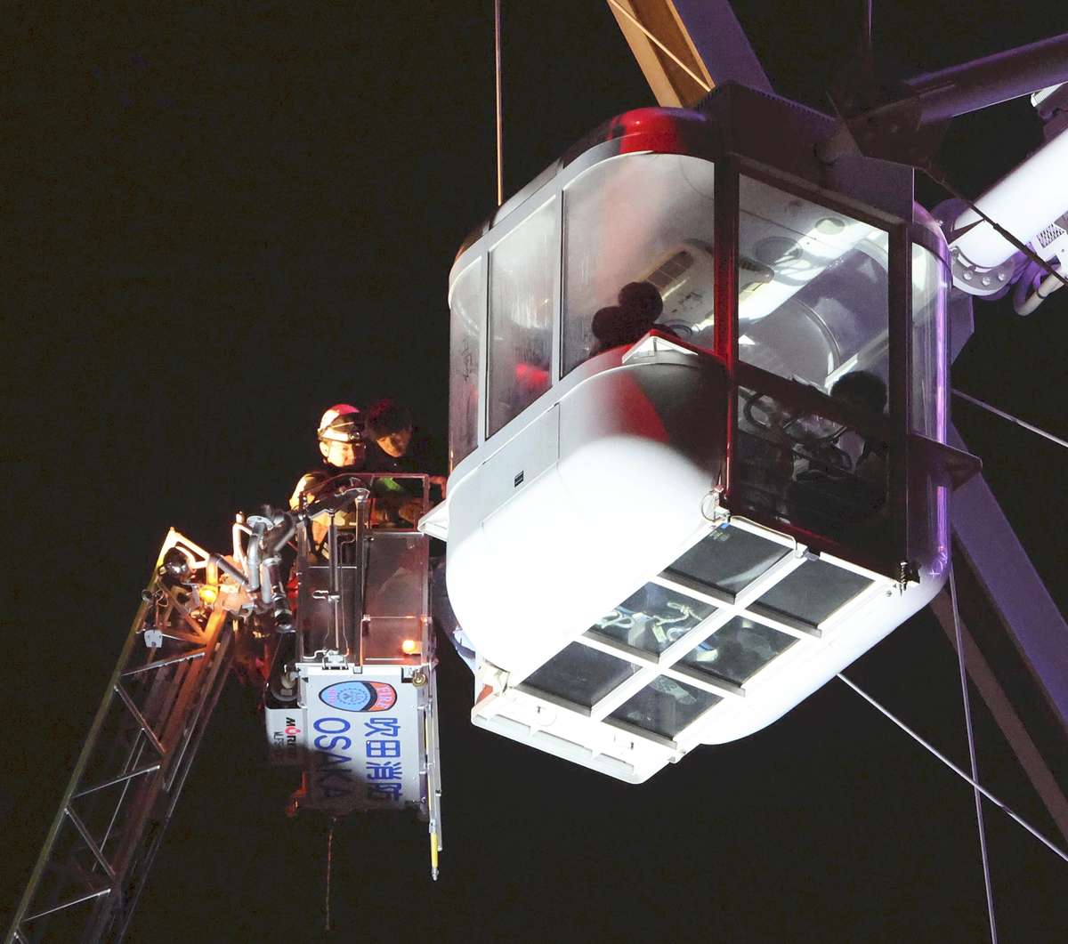 Passengers are rescued from a gondola on the Osaka Wheel in Suita, Osaka Prefecture, at 1:28 a.m. on Wednesday.
