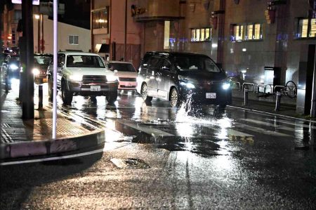 A road is partially covered with water that surged out in Hachinohe, Aomori Prefecture, on late Monday. -