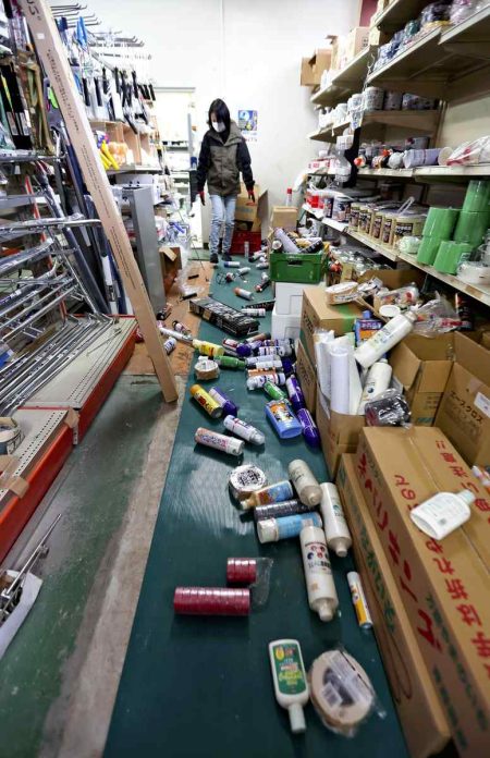 Goods are scattered on the floor of a hardware store in Tohoku, Aomori Prefecture, on Tuesday morning.