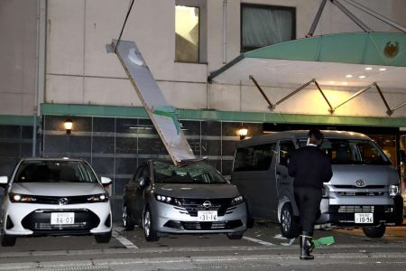 A hotel sign that fell on a car is seen in Mutsu, Aomori Prefecture, on early Tuesday.