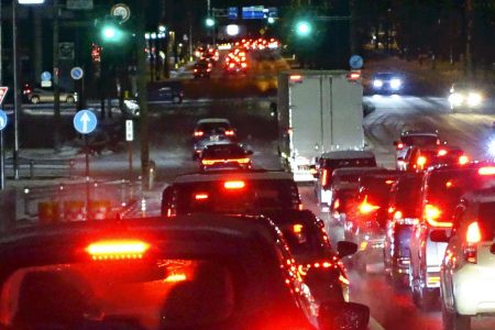 Vehicles are seen heading to high ground about two kilometers inland from the coast in Tomakomai, Hokkaido, on late Monday.