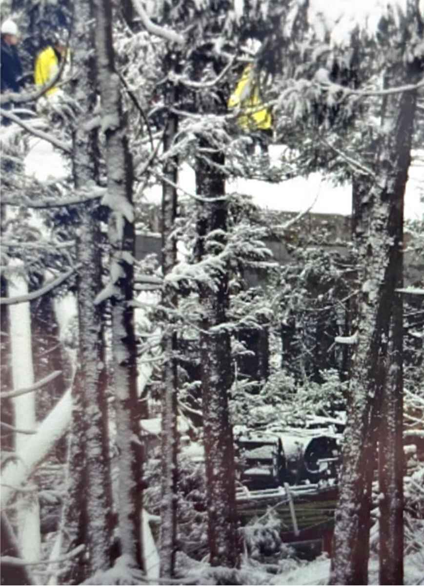 The fallen train is seen among the trees in Kitaakita, Akita Prefecture, on Friday.