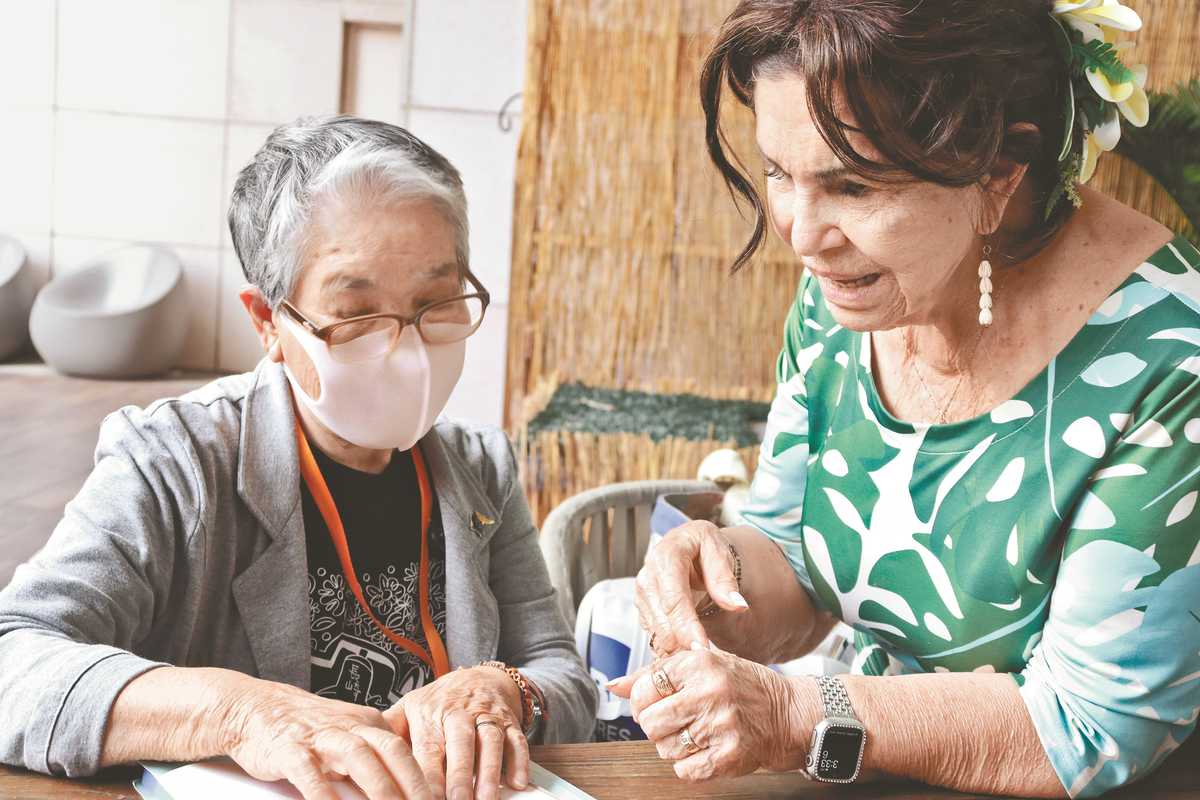 Chiyoko Motomura, left, and Dorinda Nicholson converse in Honolulu on Dec 6.