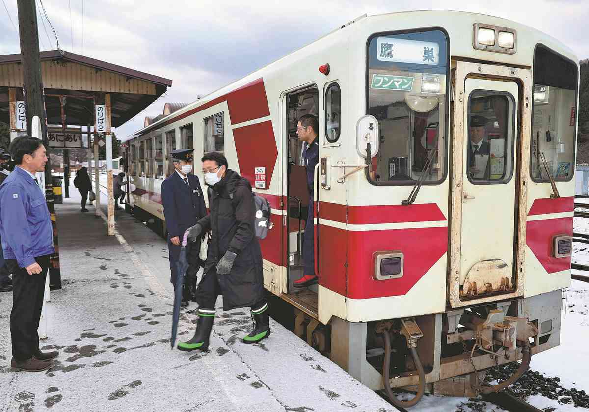 Passengers get off an Akita Nairiku Line train in Kitaakita, Akita Prefecture, on Tuesday.