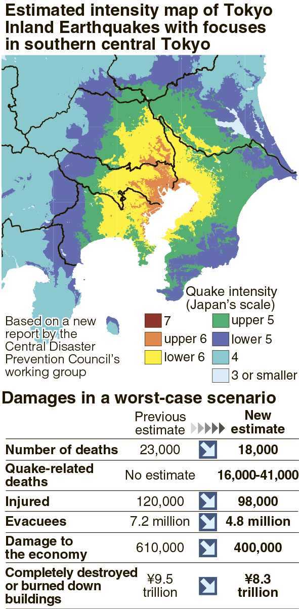 If a magnitude-7 class earthquake were to occur with its epicenter in the southern part of central Tokyo, it would cause powerful shaking over a wide area, and in the worst case scenario, approximately 18,000 people could be killed, according to the damage estimates released by the government on Friday.