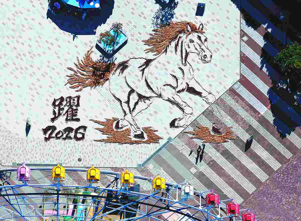 A giant work of art featuring next year’s zodiac sign, the Horse, decorates the ground at Hitachi Seaside National Government Park in Hitachinaka, Ibaraki Prefecture.