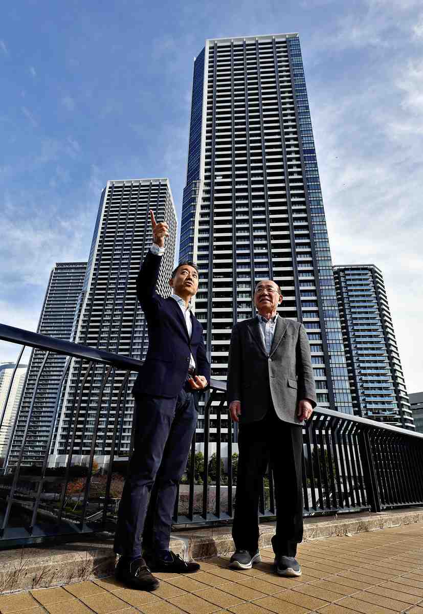 The chairperson of a citizens’ disaster prevention group, right, stands with the high-rise Deux Tours condominium in the background in Chuo Ward, Tokyo, on Dec. 10.
