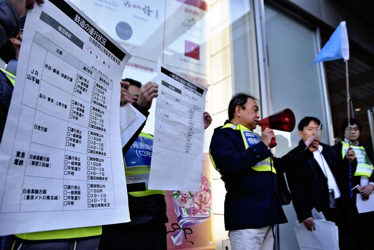 Members of a council related to disaster response conduct an exercise in which they inform passersby near Meguro Station about train operation information on Wednesday.