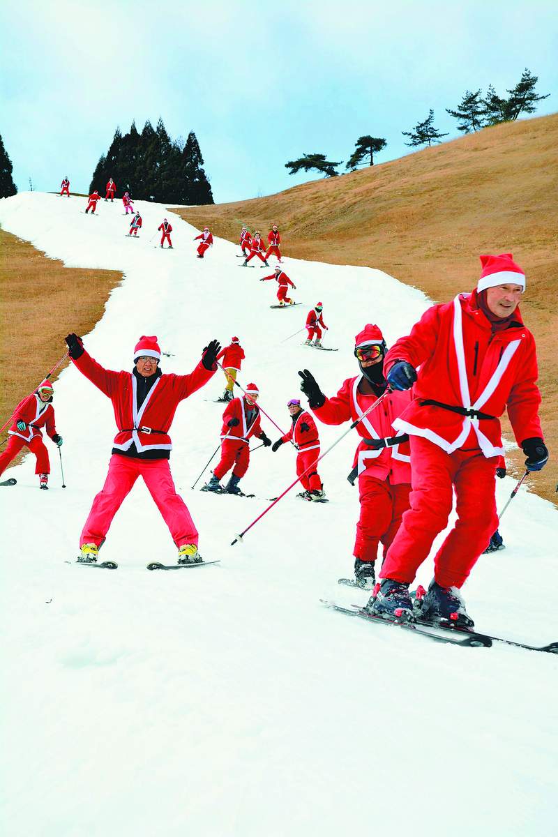 Skiers dressed as Santa Claus glide gracefully down the slopes at Hakodateyama Ski Resort in Takashima, Shiga Prefecture, on Tuesday. This annual event, held since 2015 to boost Christmas spirit, attracted 30 participants this year. After the starting signal, participants started slowly gliding together in a line down the approximately 300-meter course, waving to cheering spectators. “It was fun skiing together in matching outfits,” said a local second-year junior high school student who participated with two friends. The resort opened Saturday and plans to operate daily through March 22.