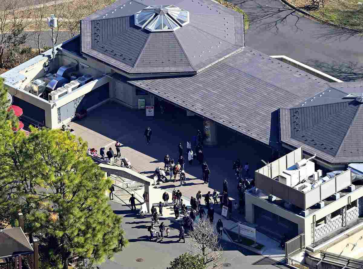 People are seen around a building at Tama Zoological Park in Hino, Tokyo, in the afternoon on Sunday while a search was being conducted for one of its eastern timber wolves.