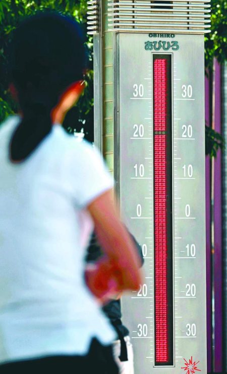 A thermometer in front of JR Obihiro Station reaches its maximum reading on July 24 in Obihiro, Hokkaido.