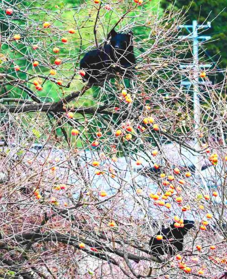 Two bears eat persimmons in a residential area in Iwaizumi, Iwate Prefecture.