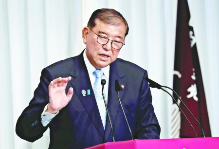 Then Prime Minister Shigeru Ishiba speaks at a press conference at Liberal Democratic Party headquarters.