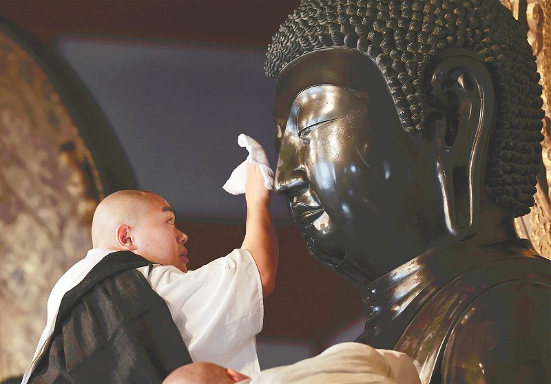 A monk wipes dust from a Buddhist statue in Nara on Monday.