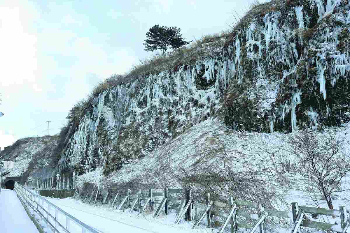 Water seeping from rocky cliffs freezes, forming ice curtains near Senjojiki Station on the JR Gono Line in Fukaura, Aomori Prefecture, delighting passersby. Exposed to cold winds from the Sea of Japan, icicles hang over an area about 20 meters high and 100 meters wide, creating a popular winter attraction. The icicles shrunk as the cold eased over the weekend, but the ice curtains are expected to grow again if the cold temperatures persist. In most years, their peak viewing period lasts through February.