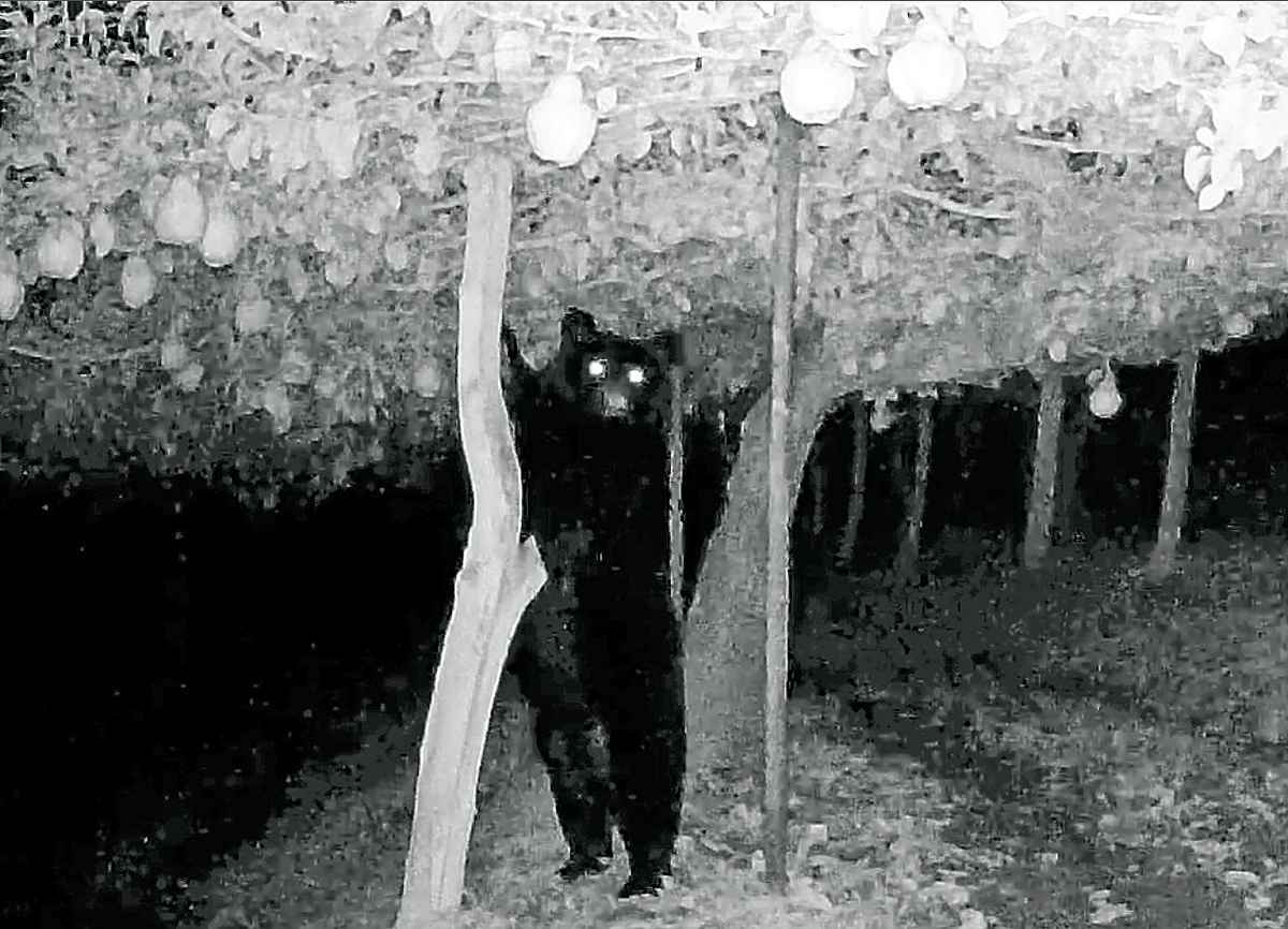 On the night of Oct. 24 last year, a bear was captured on surveillance cameras at an orchard in Kaminoyama, Yamagata Prefecture. It stood up on two legs and placed its front paws on a pear tree laden with fruit. However, perhaps sensing something, it looked around and then left the area.