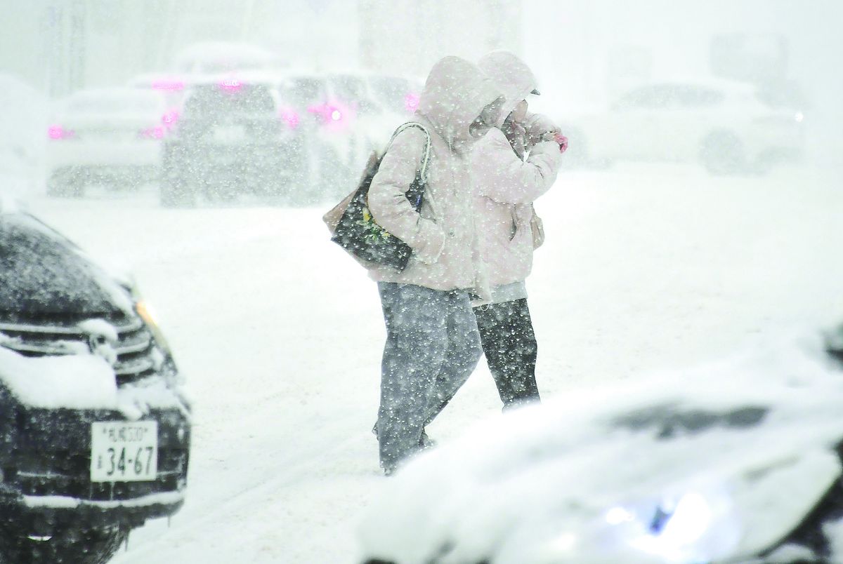 People bundled up walk in the snow in Sapporo on Wednesday morning. Severe winter weather is gripping the Sea of Japan side of northern Japan, especially along the mountains. The Japan Meteorological Agency is calling for people to be vigilant as heavy snow is expected even in non-mountainous areas. The agency said the cold front will intensify on Thursday, with the cold weather expected to continue until around Sunday.