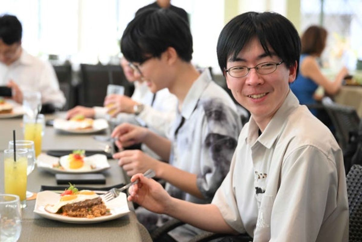 Shibano, right, enjoys his lunch and shows little sign of fatigue from the long flight.