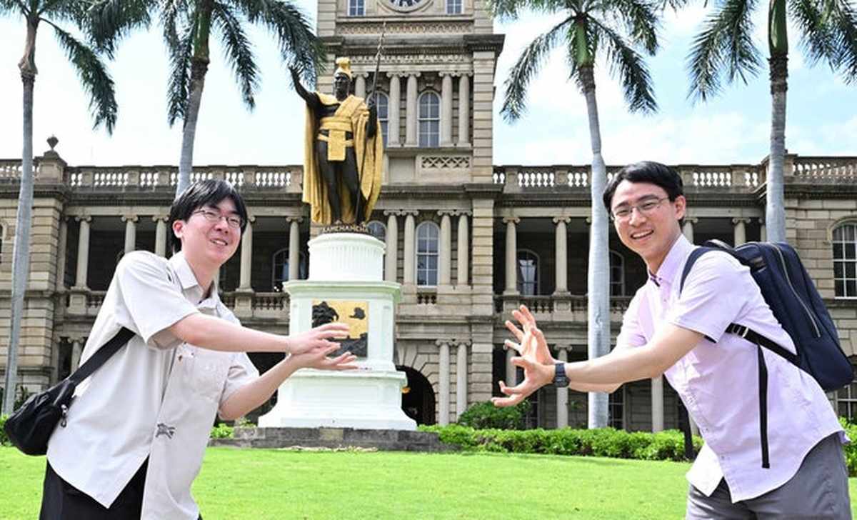 Ryo Ichiriki, right, and Toramaru Shibano pose for a photo in front of a King Kamehameha statue.