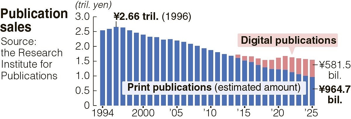 Paper book and magazine sales in 2025 declined by 4.1% from the previous year to reach an estimated ¥964.7 billion, the Research Institute for Publications announced Monday, marking the first time in 50 years that the figure has fallen below ¥1 trillion.