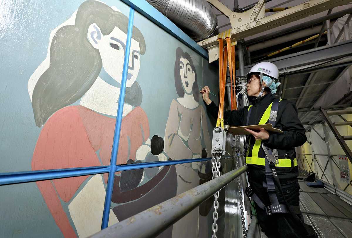 The third restoration of the mural started in June 2025. About 20 people, including officials from Tokyo University of the Arts — which inked a comprehensive partnership agreement with East Japan Railway Co. (JR East) — have been carefully working on this project and restoring the mural by attaching and repairing parts where the paint has lifted, filling in parts that have flaked off with putty and repainting areas in need of touchups.