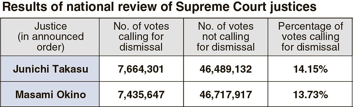 The percentage of votes seeking to dismiss the justices was 13.94%, the second highest on record following the one set in 1980, when the percentage was 14.38%. Valid votes that supported the dismissal of former lawyer Takasu was 14.15%, while former scholar Okino’s removal was supported by 13.73%.