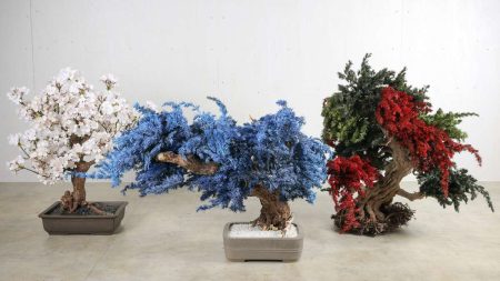 A Japanese black pine Dry Bonsai, center, features blue leaves, while an azalea Dry Bonsai, left, bears cherry blossoms. The combination of green and red leaves on the azalea on the right shows how the leaves change colors with the seasons.