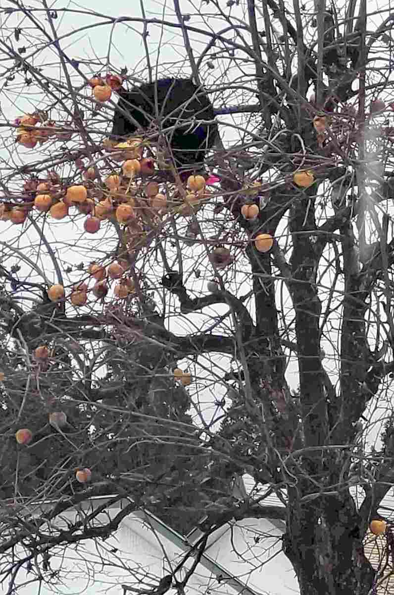 A bear in a tree eats persimmons in Tokamachi, Niigata Prefecture, on Dec. 12.
