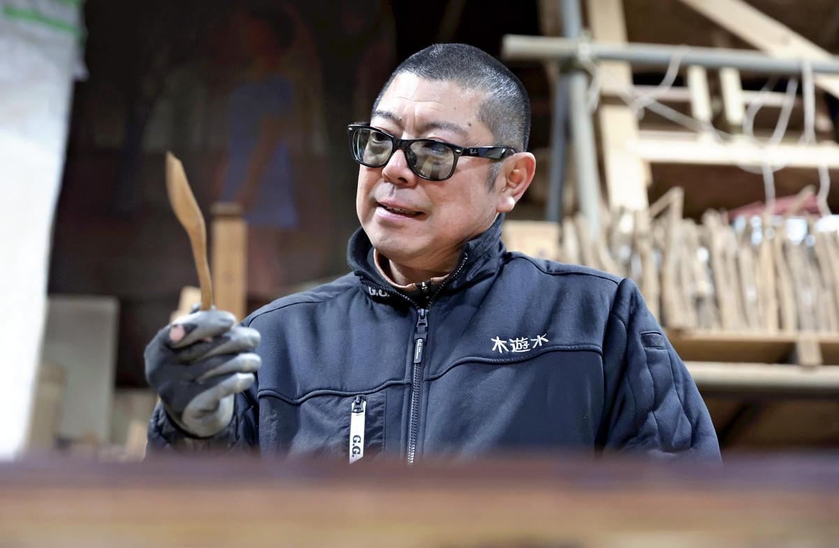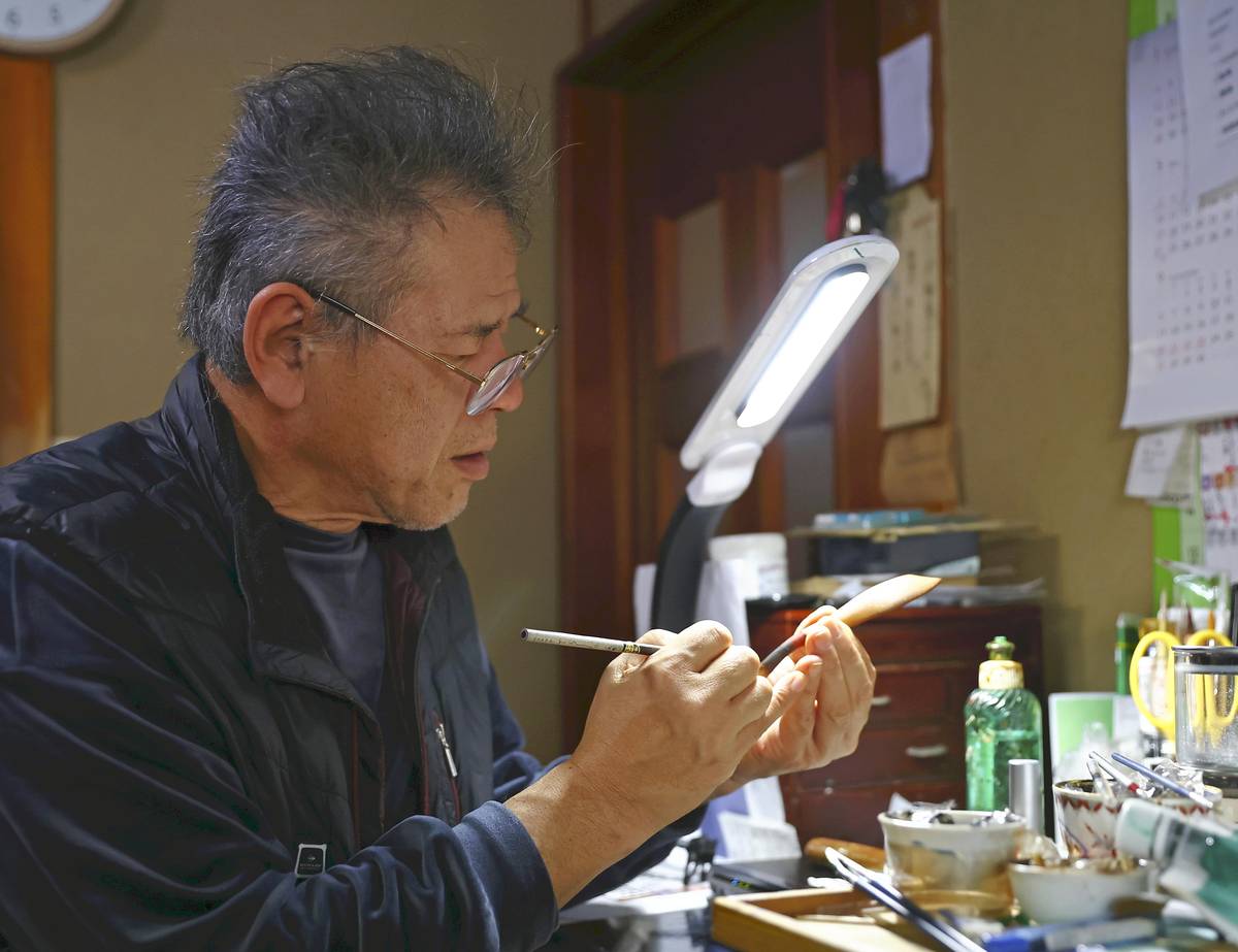 Satoshi Kiso, a Wajima lacquerware artisan from Nonoichi, Ishikawa Prefecture, applies lacquer to woodworks delivered by Shinichi Endo.