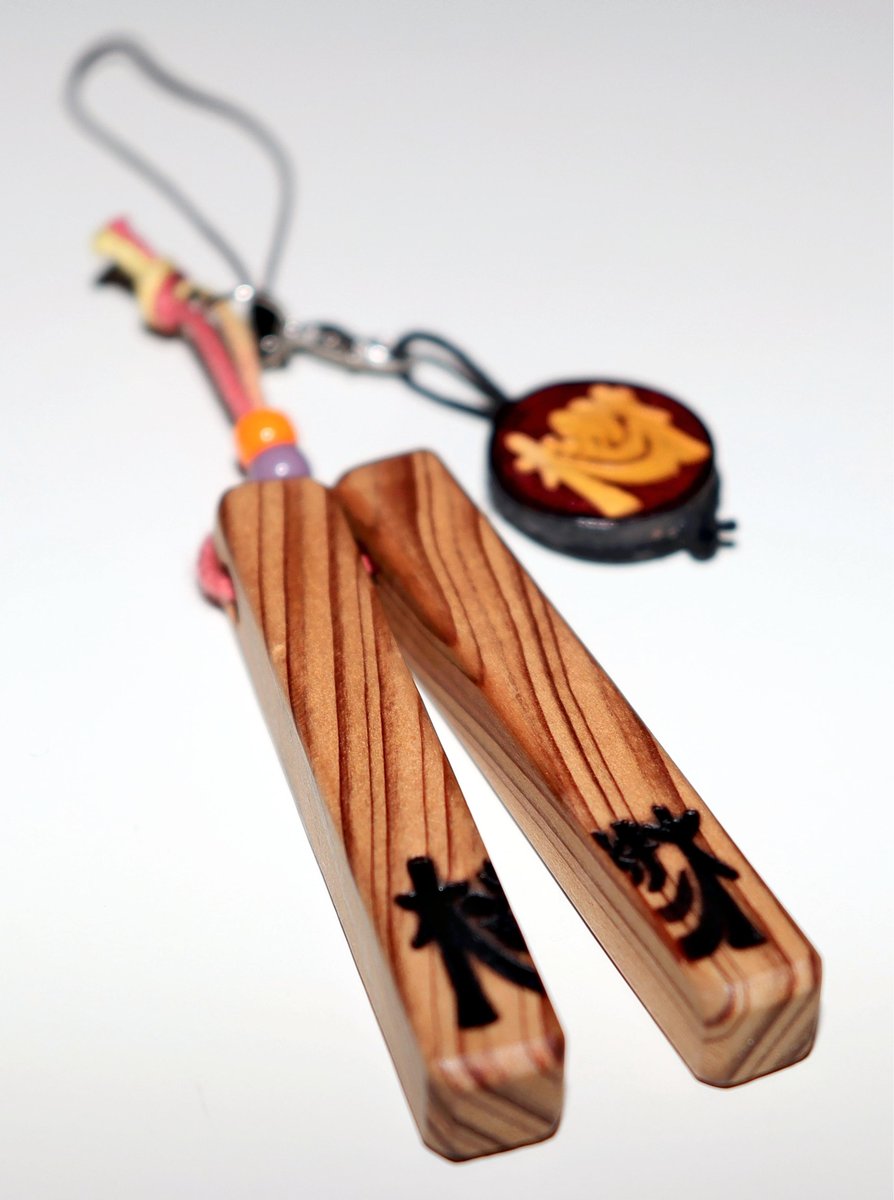 Six-centimeter-long wooden clapper straps, processed from debris washed ashore by tsunami, are among the seven types of woodwork the two produce. Just as people need the support of others, the clappers will not make a sound unless both are together.