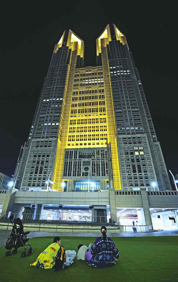 The Tokyo Metropolitan Government building is illuminated yellow to represent the mimosa flower in honor of International Women’s Day on Sunday night. Mimosas came to be widely recognized as the symbol for International Women’s Day through the custom of men gifting women the flower on the day in Italy.