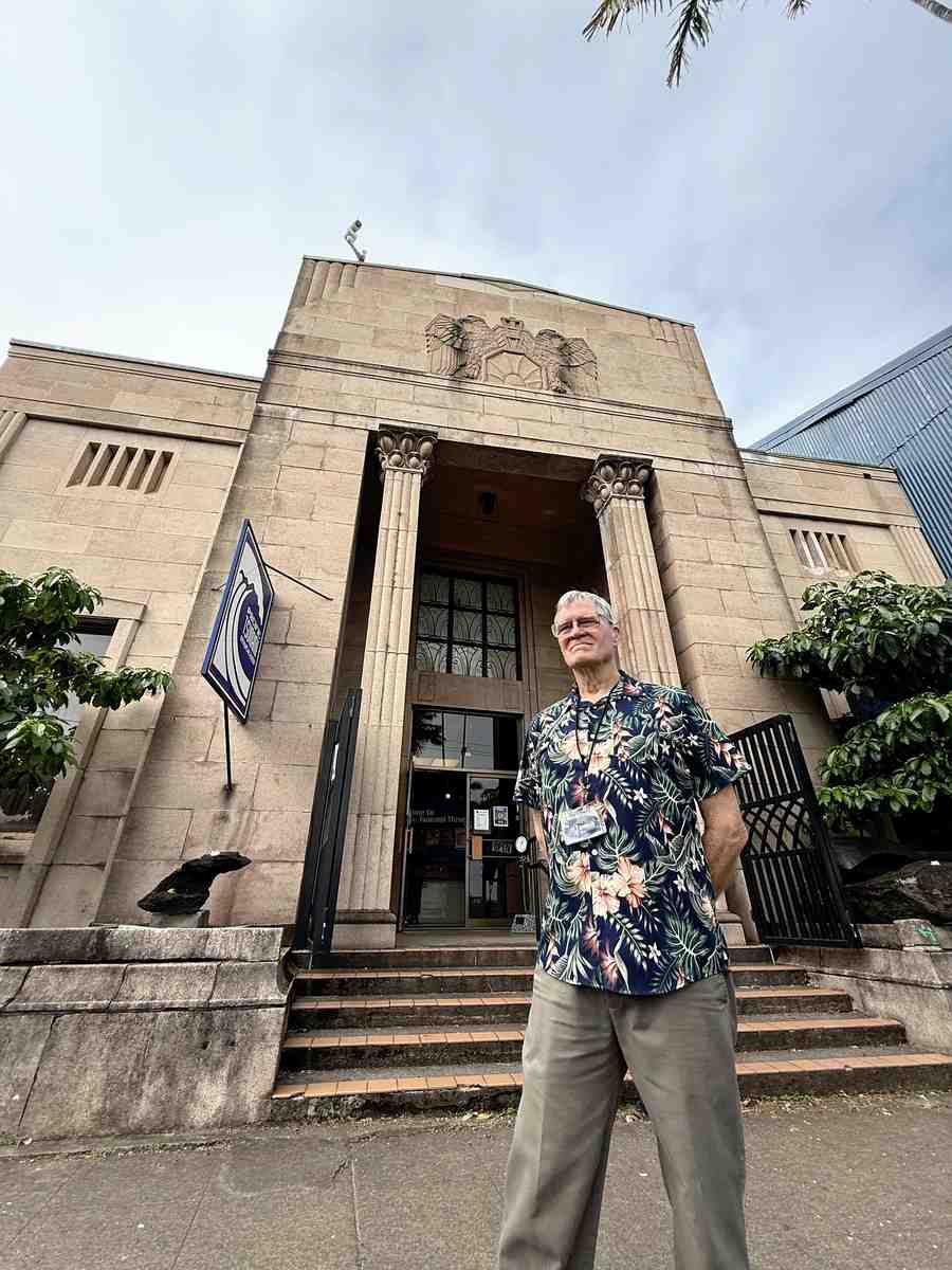 Volunteer guide Tom Forbes stands in front of the Pacific Tsunami Museum in Hilo, Hawaii, on Feb. 7.