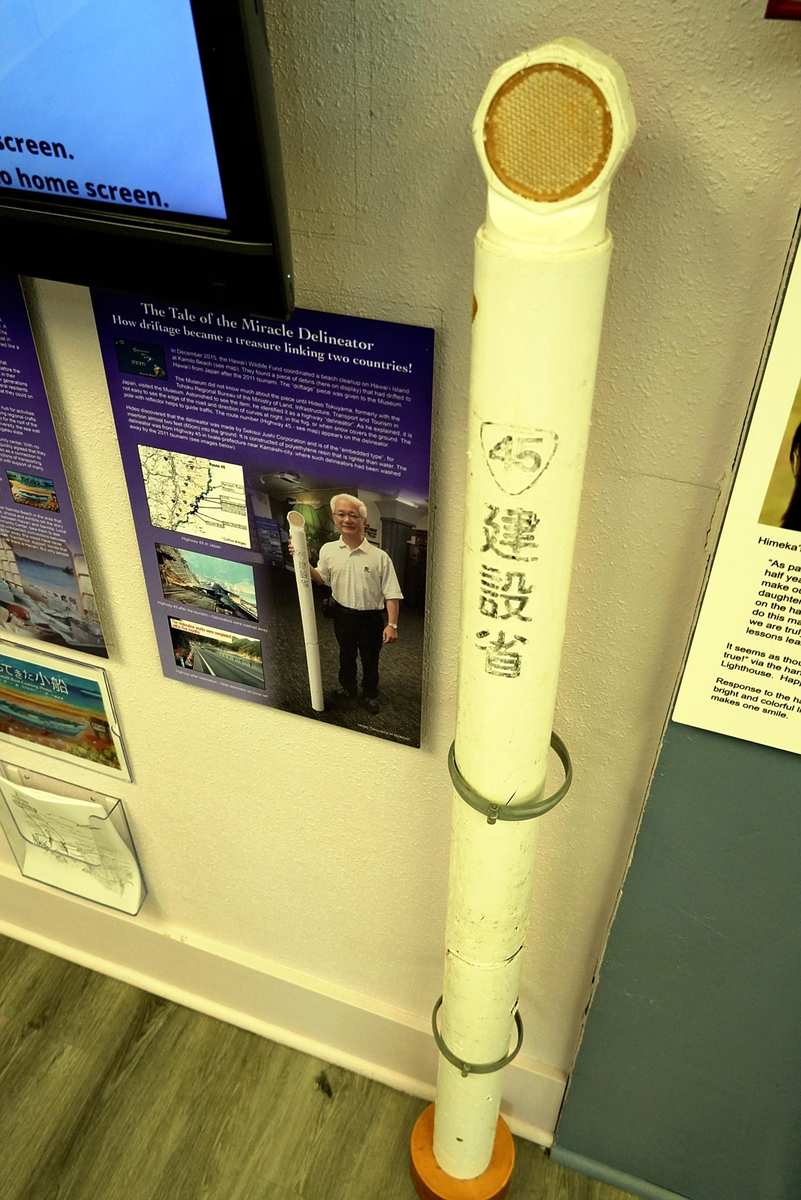 A section featuring the Great East Japan Earthquake displays a road delineator from Japan’s National Route 45 that reached the shores of Hawaii Island all the way from Kamaishi, Iwate Prefecture, about 6,300 kilometers away.