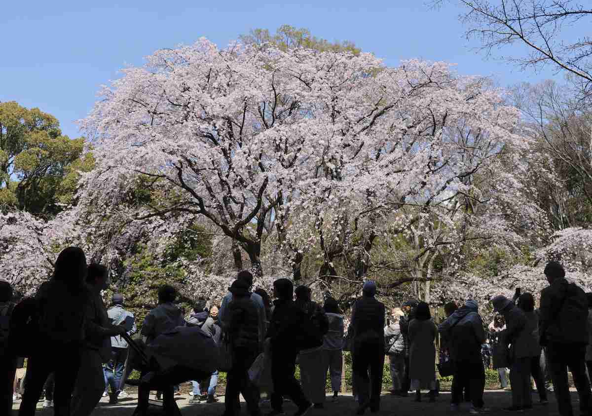 The famous weeping cherry tree at Rikugien, a Japanese garden in Bunkyo Ward, Tokyo, reached full bloom on Tuesday.