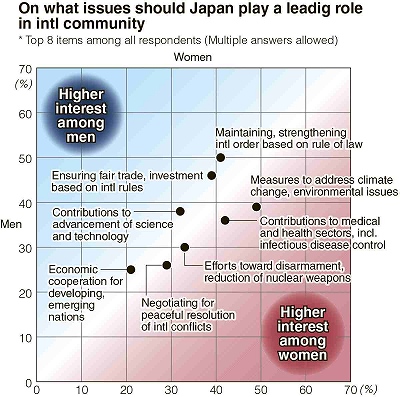 Respondents were also asked what role Japan should play in the international community, with multiple answers allowed from 13 options. The most popular response was “maintaining and strengthening the international order based on the rule of law,” at 45%. Amid growing instability around the world, many respondents showed support for Japan’s stress on international rules.