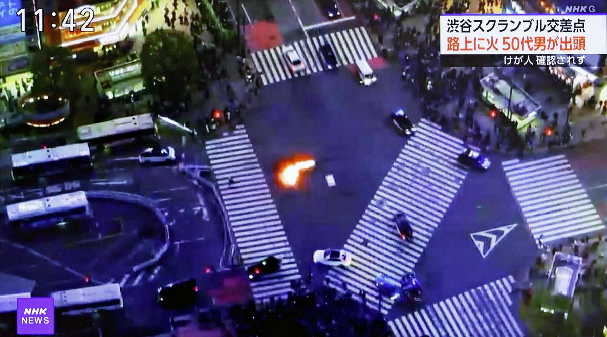 A fire is seen in the middle of the Shibuya Scramble Crossing in Tokyo in this screen grab from NHK.